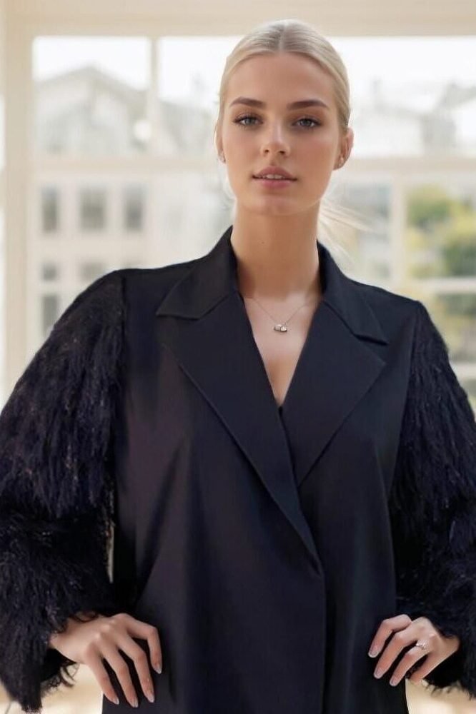 Abaya with wide sleeves, luxurious black clutch decorated with shiny fringes