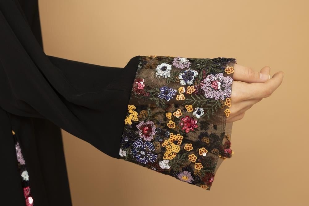 Abaya with elegant patterned details on the sleeves and front edge