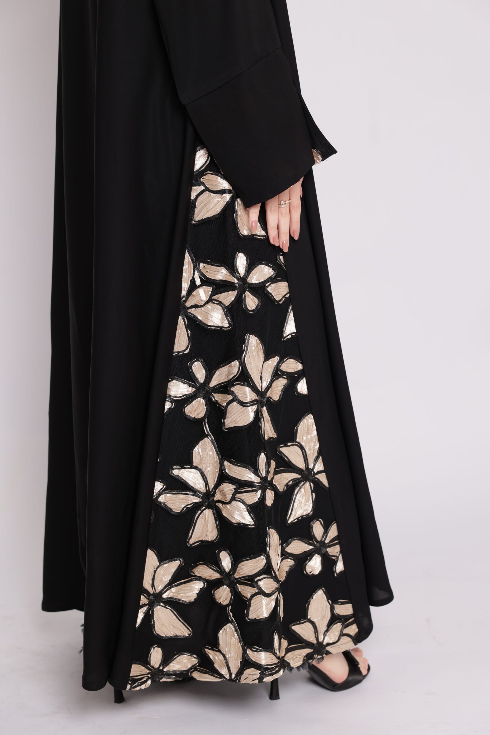 Black abaya with side embroidery and cufflinks decorated with shiny floral patterns in gold and beige