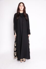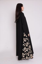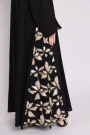 عباية باللون الأسود بتطريز جانبي وأطراف أكمام مزينة بنقوش زهرية لامعة بالون الذهبي والبيج – التفاصيل الملكية في عبايات سعودية تطريز زهري فاخر!