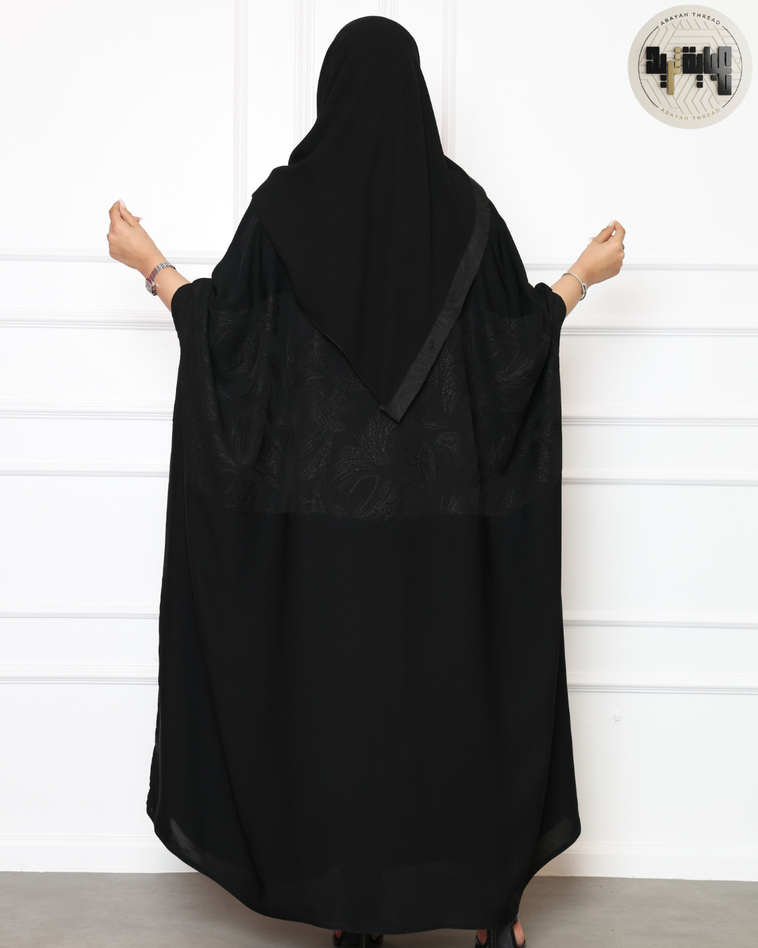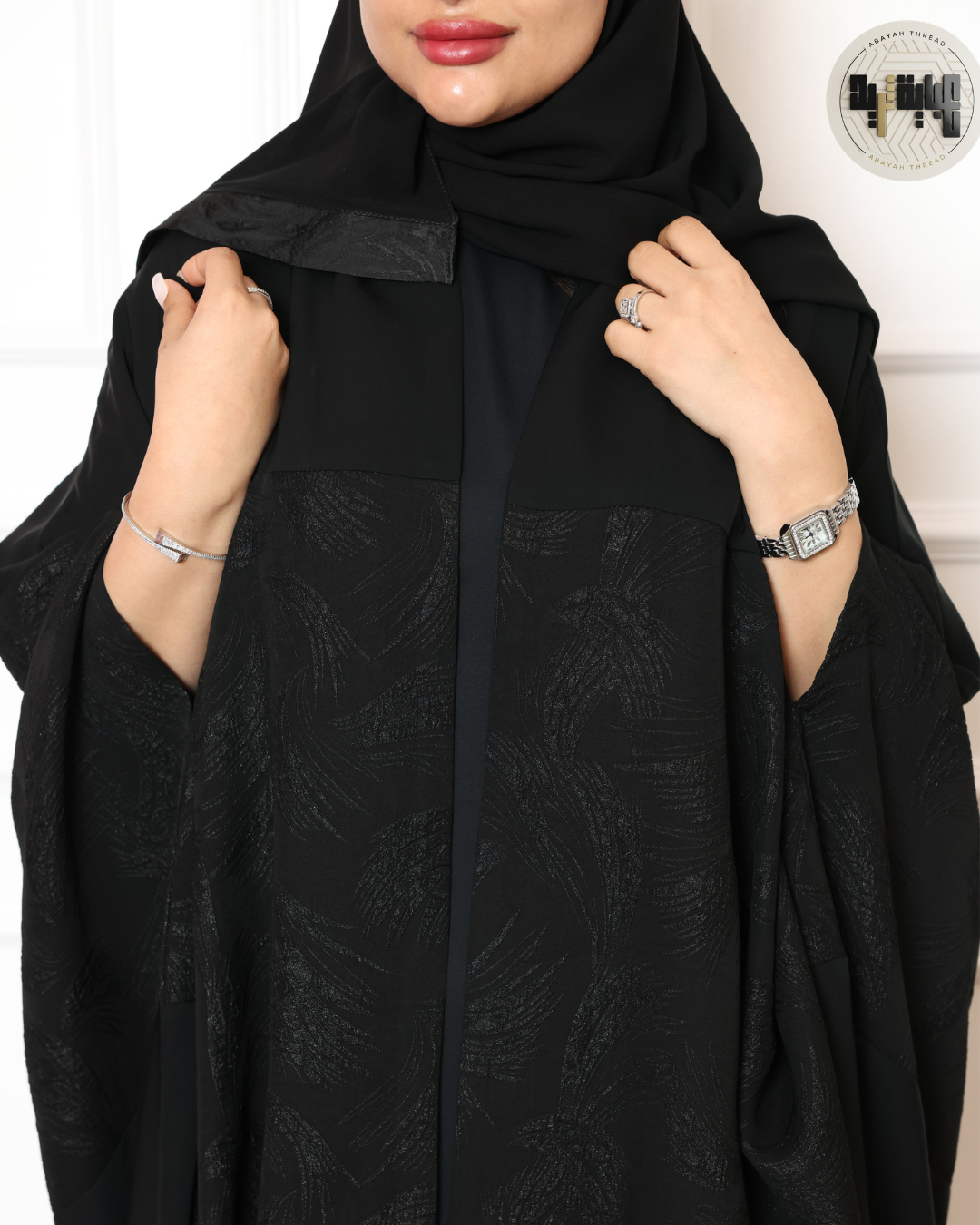 القصة الملكية للبشت القطري مع النقش المشجر الفضّي على خلفية سوداء فاخرة تخلق تناغماً بصرياً جذاباً، بينما يمنحك قماش الكريب الفاخر راحة وانسيابية استثنائية. هذه العباية ليست مجرد قطعة ملابس، بل تعبير عن ذوقك الرفيع الذي يمزج بين التراث والأناقة العصرية.