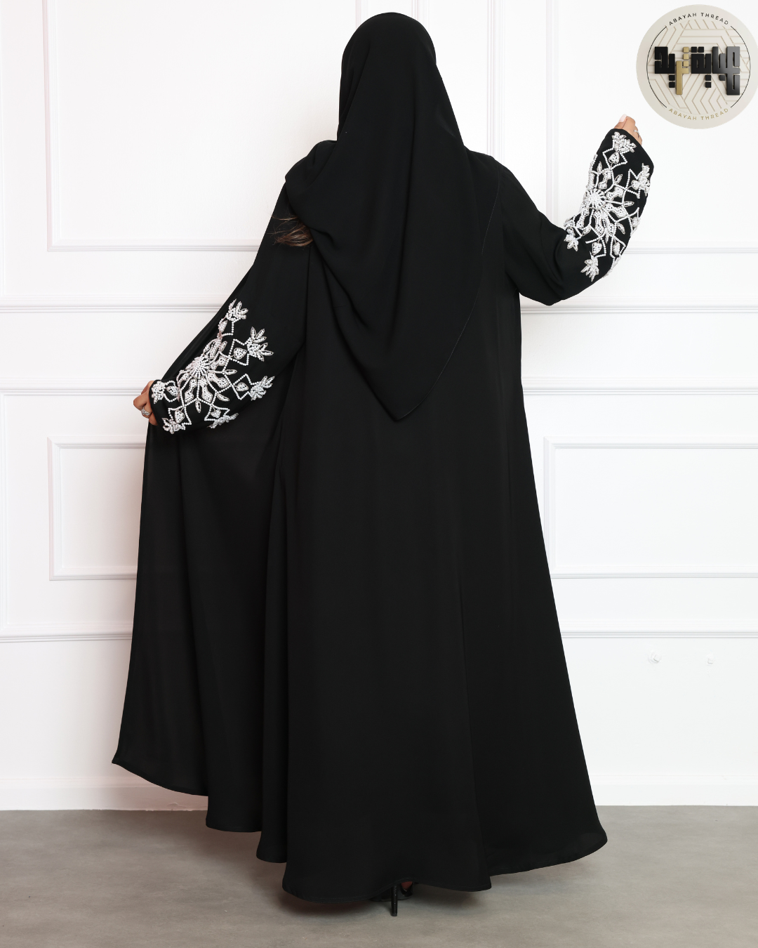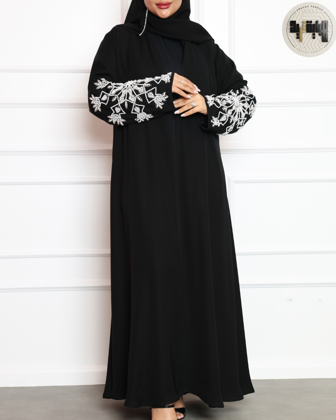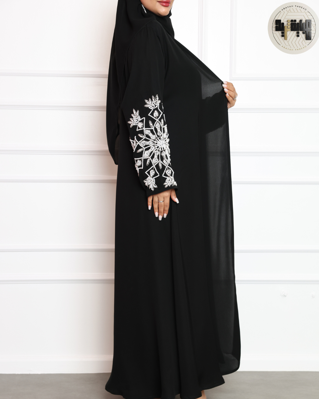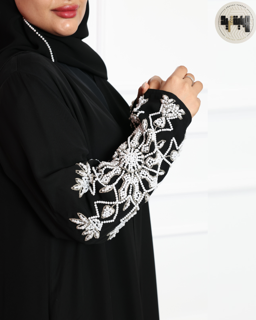 ما يميز هذه العباية حقاً هو التطريز اللؤلؤي المتقن على الأكمام: