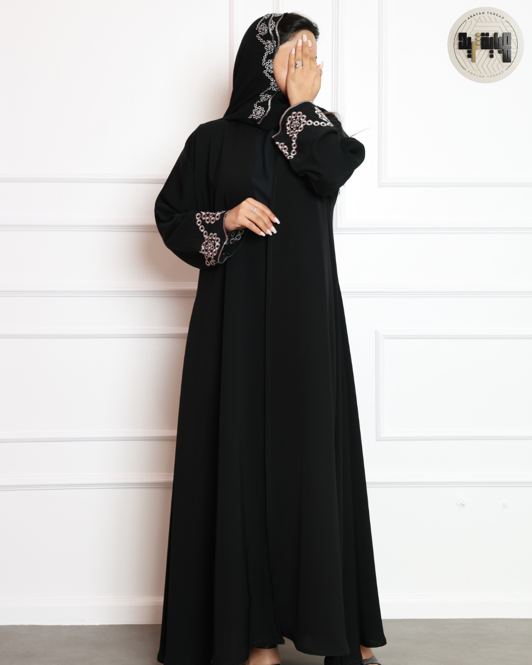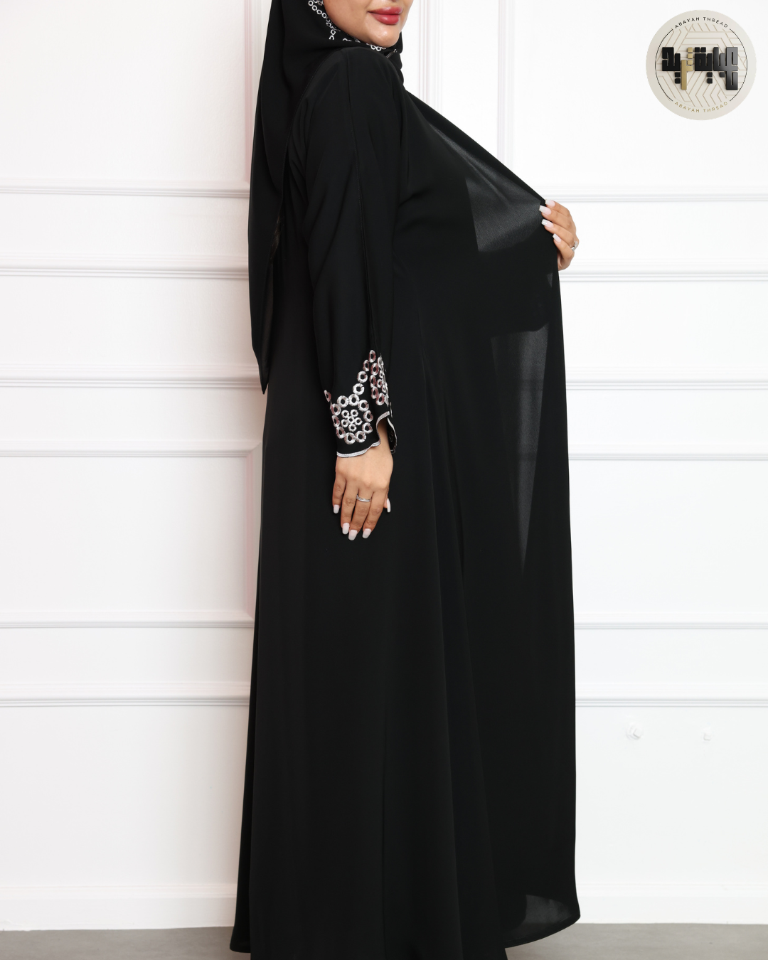إذا كنتِ تبحثين عن عبايات سهرة تجمع بين الأناقة الكلاسيكية واللمسة الفنية الرقيقة، فإن عباية سوداء بأكمام مطرزة بنقوش بيضاء من عباية ثريد هي قطعتك المثالية. صُممت هذه العباية بعناية لتكون خيارك الأول في عبايات مناسبات راقية، حيث تتركز الفخامة في تفاصيل التطريز الأنيق على الأكمام، لتمنحك إطلالة متوازنة بين البساطة والتميز.