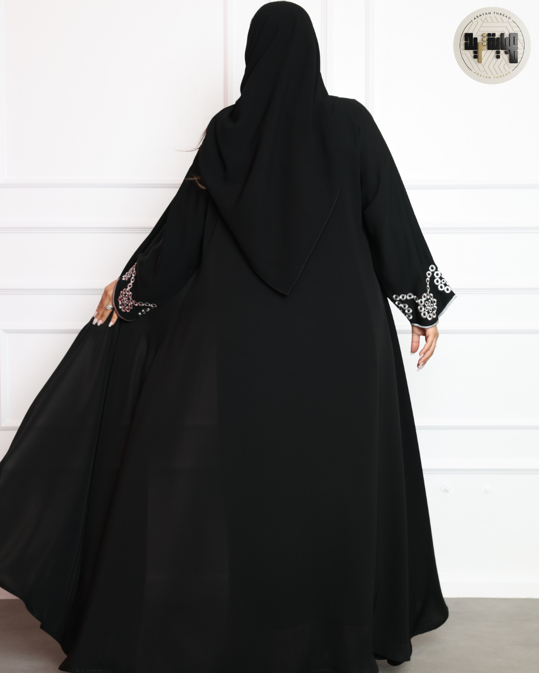 عباية سوداء بأكمام مطرزة بنقوش بيضاء هي قطعة كلاسيكية استثنائية لمن تحب الأناقة الهادئة والمتفردة. عندما ترتدينها، ستشعرين بالثقة والرقي، وستلفتين الأنظار بتفاصيلها الدقيقة دون مبالغة.