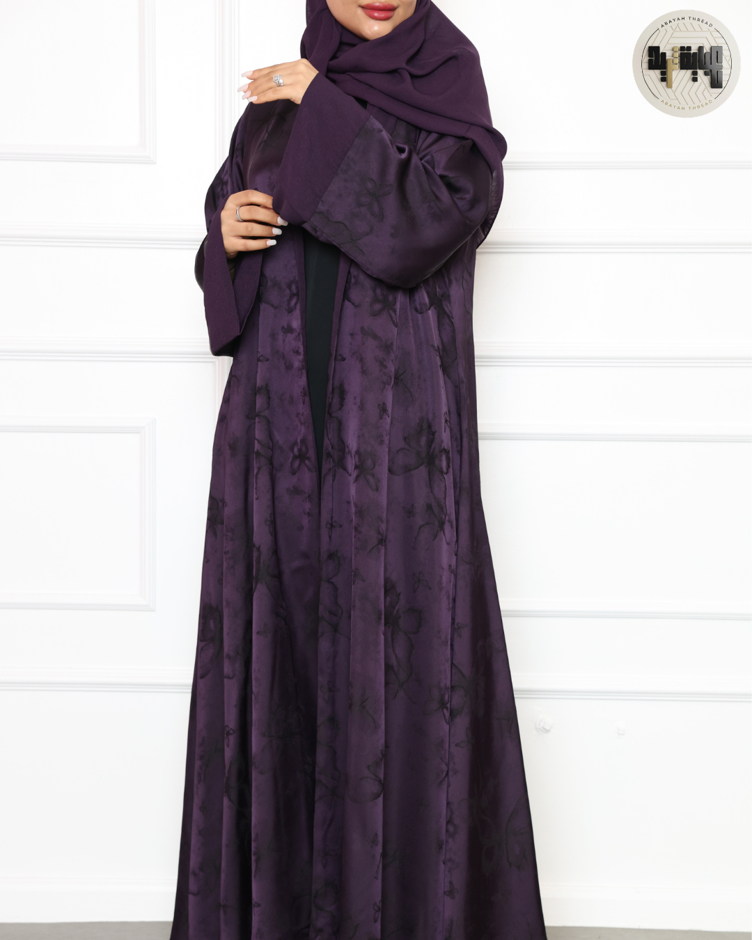 اللون الموف الهادئ يتناغم مع النقوش النباتية المنسدلة برقة، ليخلق معًا إطلالة أنثوية راقية. بينما يمنحك قماش الكريب الفاخر راحة وانسيابية استثنائية. هذه العباية ليست مجرد قطعة ملابس، بل تعبير عن ذوقك العصري الذي يحب التفاصيل الطبيعية.